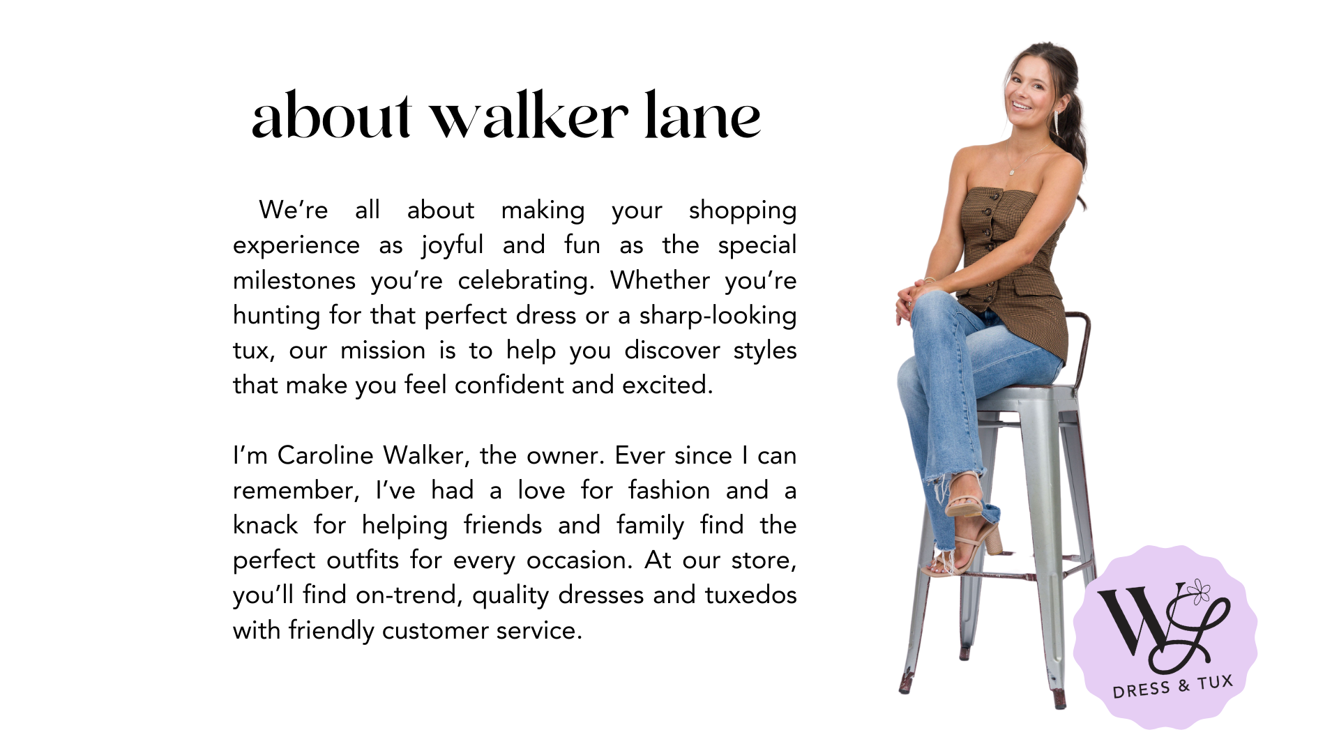 Prom appointment - During your prom appointment at Walker Lane, our stylists will help you explore a wide range of stunning dresses, ensuring you find the perfect fit and style. Enjoy a fun, relaxed atmosphere as you try on gowns and receive personalized recommendations to make your prom unforgettable!