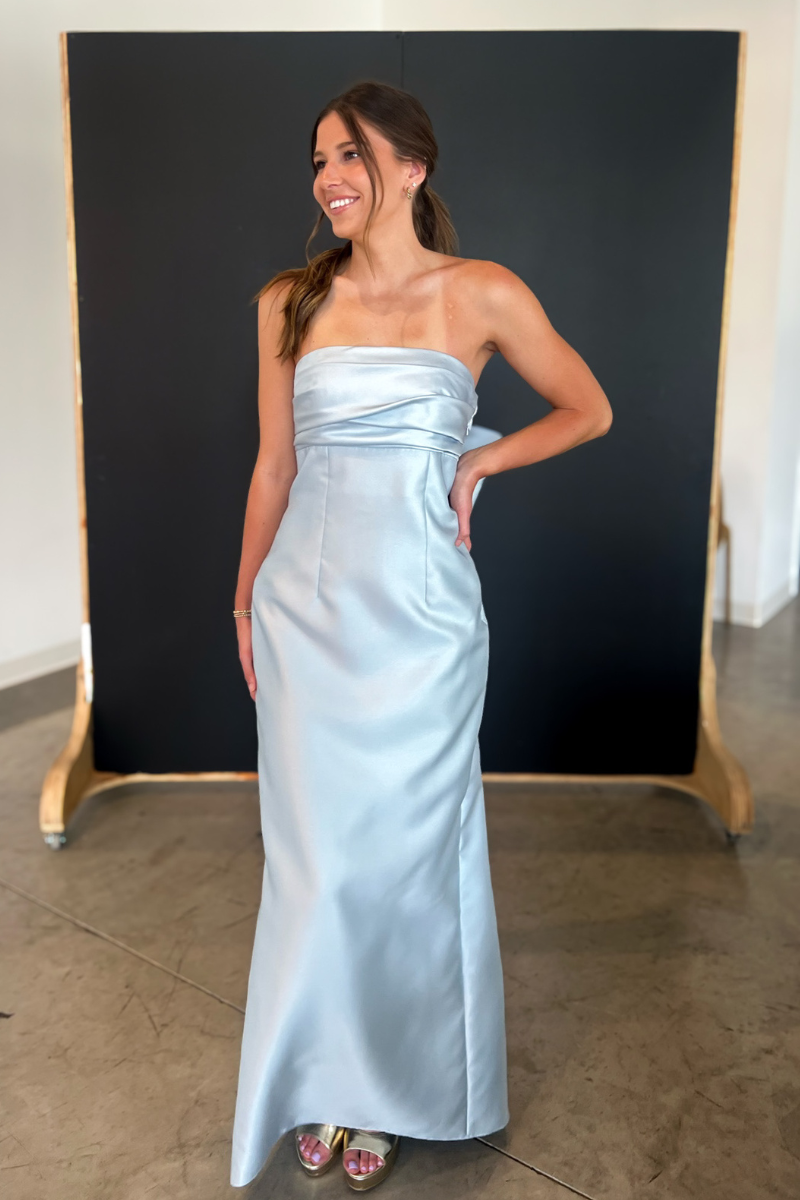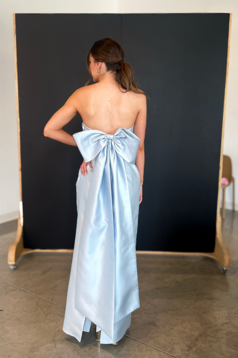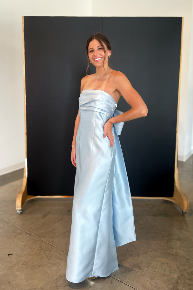 This stunning mist blue gown features a flattering strapless design and a dramatic bow detail in the back. Perfect for formal occasions, this dress will make you feel confident and elegant.