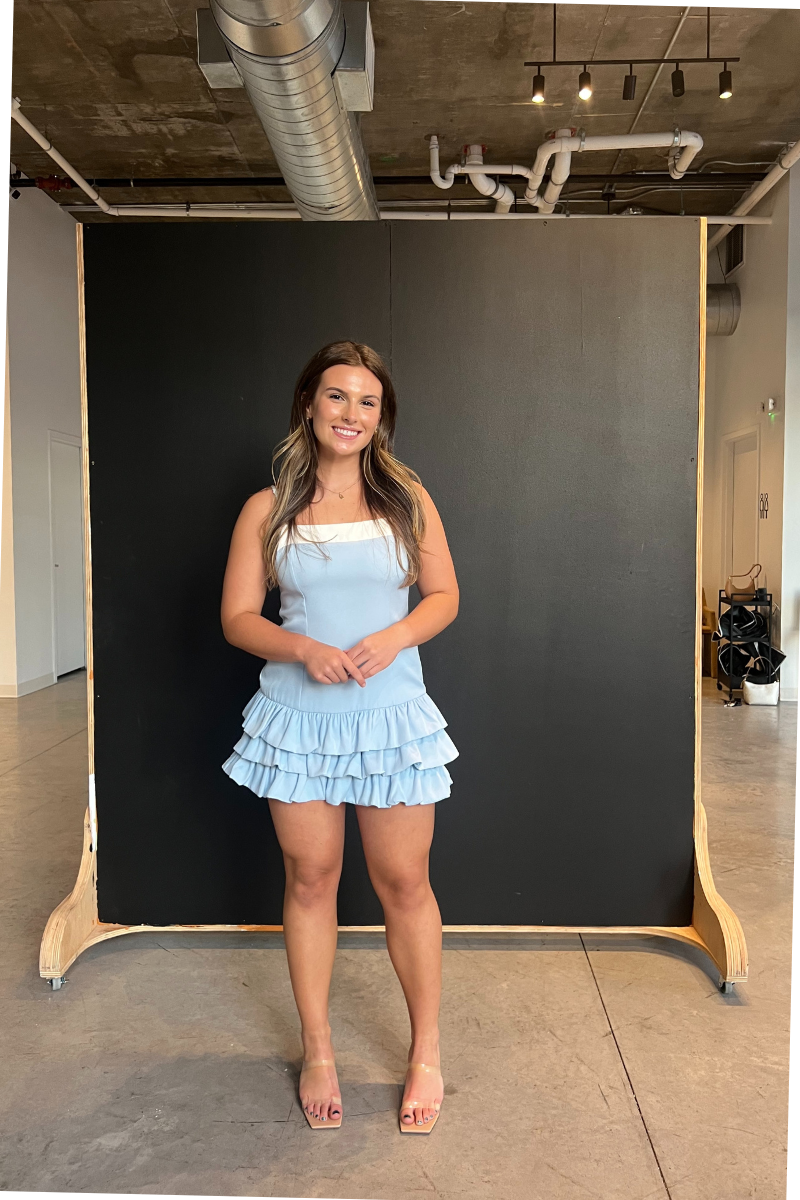 This playful, color block dress features a zipper closure int the back, flirty ruffle detail at the bottom and adjustable straps for a perfect fit.