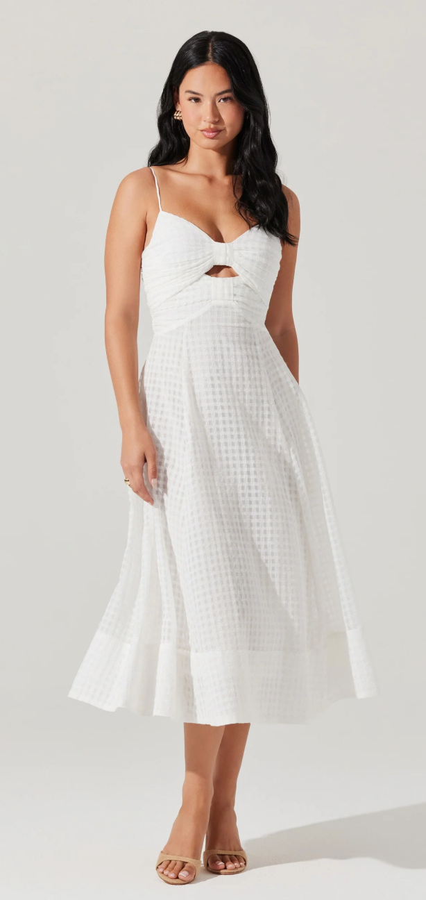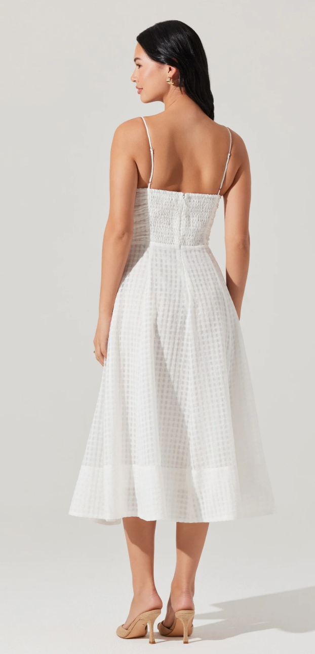 The Celina Dress in white features a delicate midi length with a subtle gingham pattern, making it an ideal choice for beach vacations or bridal celebrations. Its light, breezy fabric keeps you comfortable while adding a touch of playful charm to your look. Perfect for sunny days and special moments!