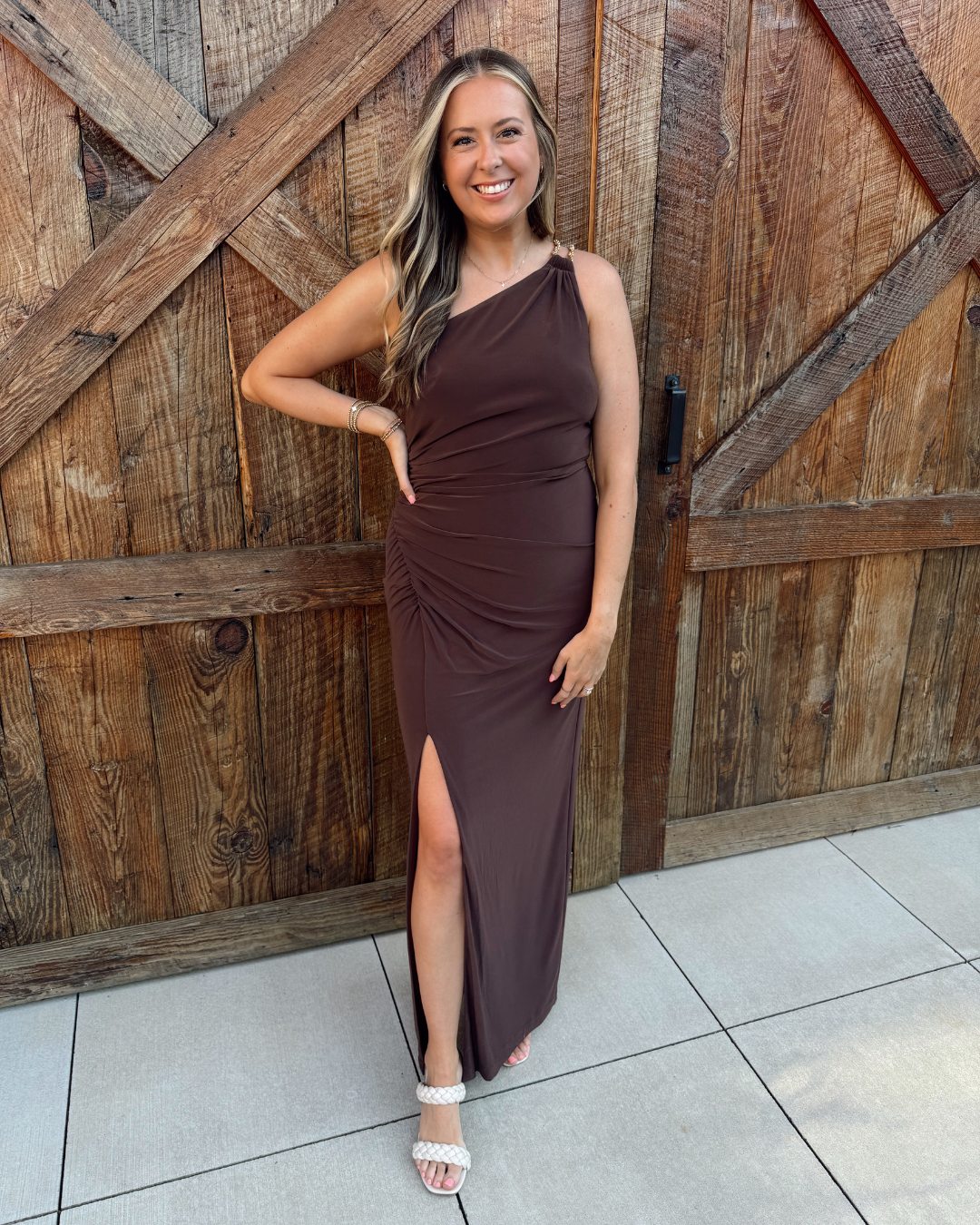 Make a statement in this rich chocolate brown maxi dress, designed with a sophisticated one-shoulder neckline and finished with an eye-catching gold detail at the shoulder. Perfect for galas, weddings, and evening events, this dress blends timeless style with a modern touch of glamour.