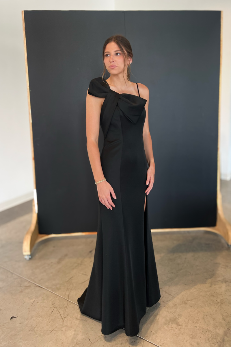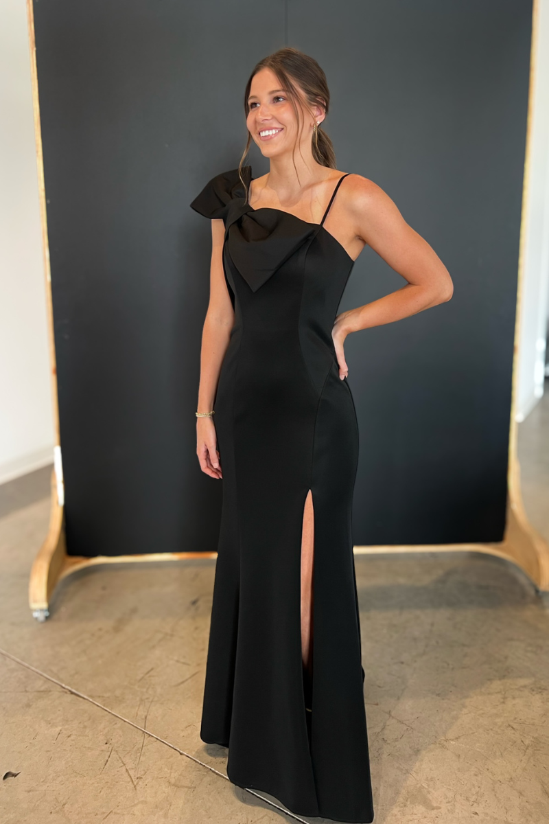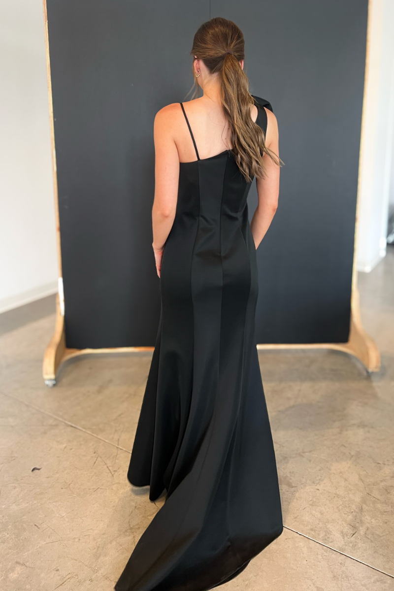 Make a statement in the Middleton Gown, crafted from scuba fabric and featuring a playful one shoulder bow detail. Perfect for formal events, this black gown will be sure to turn heads.
