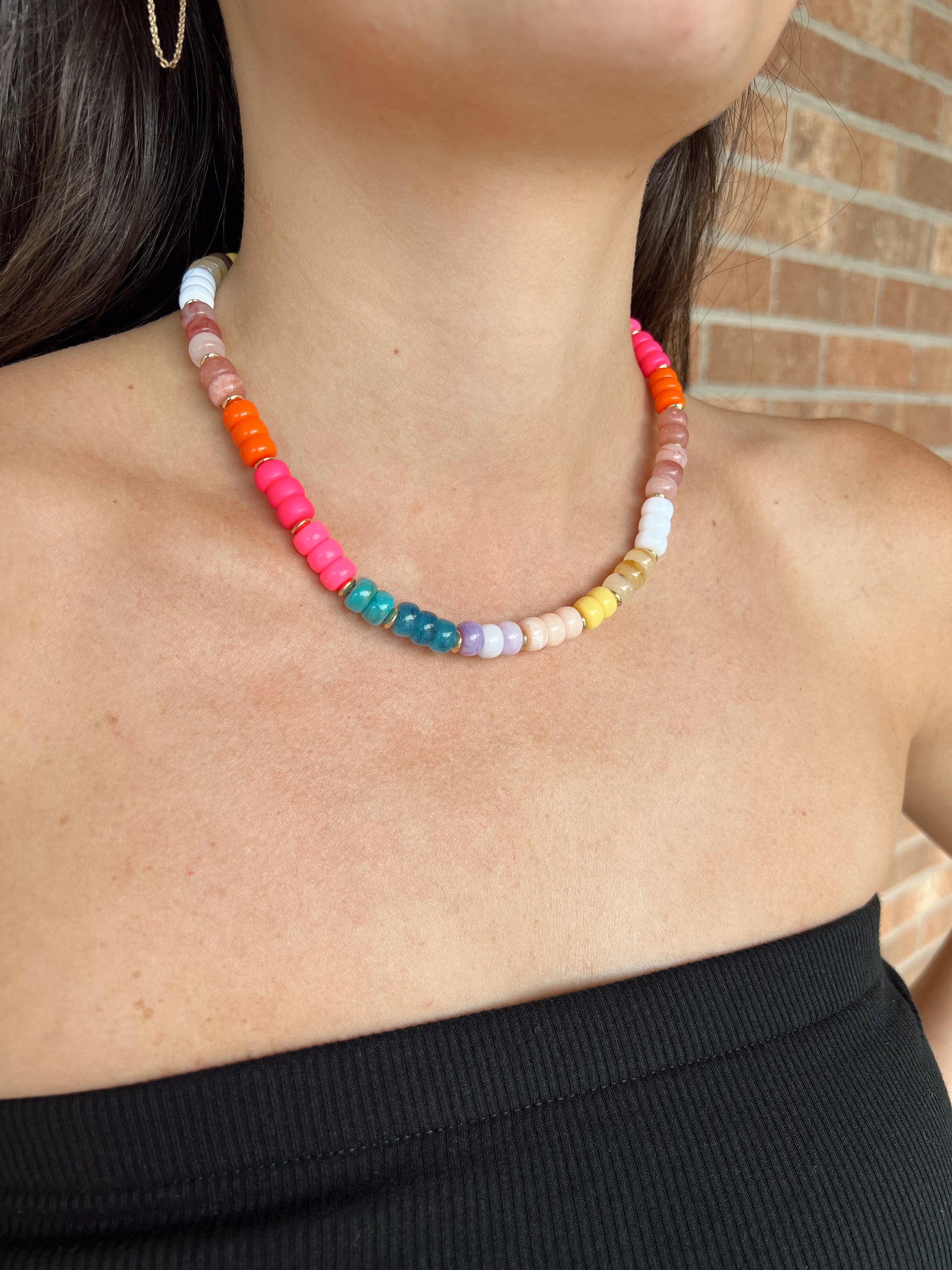 Add a pop of fun to any outfit with the Endless Weekend Beaded Necklace. Featuring bright, colorful beads accented by shimmering gold beads, this playful accessory brings a cheerful vibe and a touch of sparkle to your look.