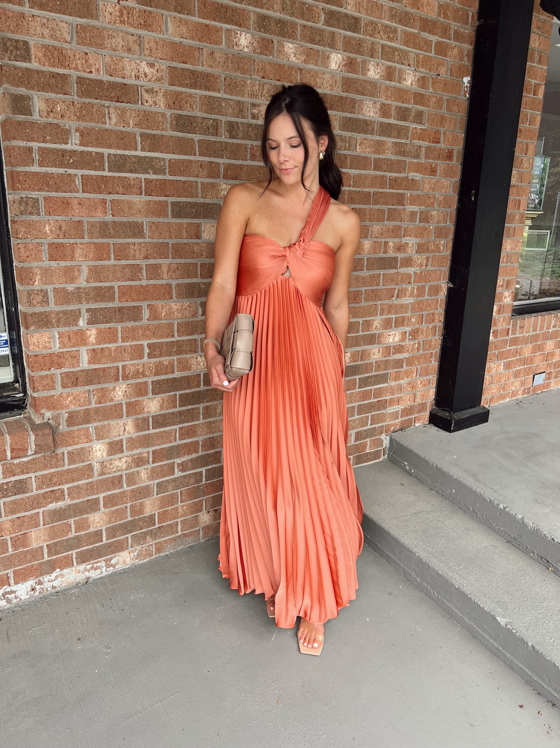 The Raysa Dress brings a splash of fun with its vibrant coral hue and playful pleated design. Featuring a chic one-shoulder silhouette, it’s perfect for dancing the night away or turning heads at any event.