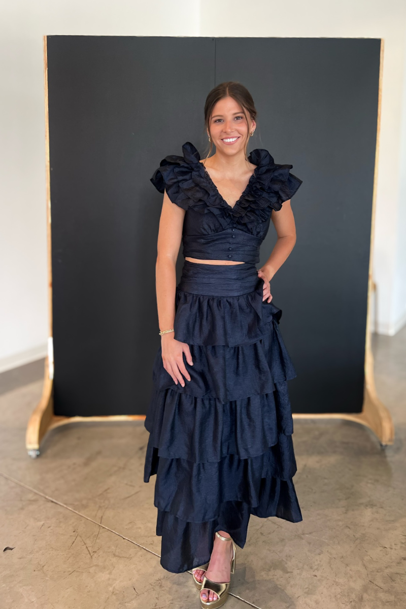 This navy set features chic ruffles on both the skirt and top, making it a versatile and stylish choice for any special occasion.